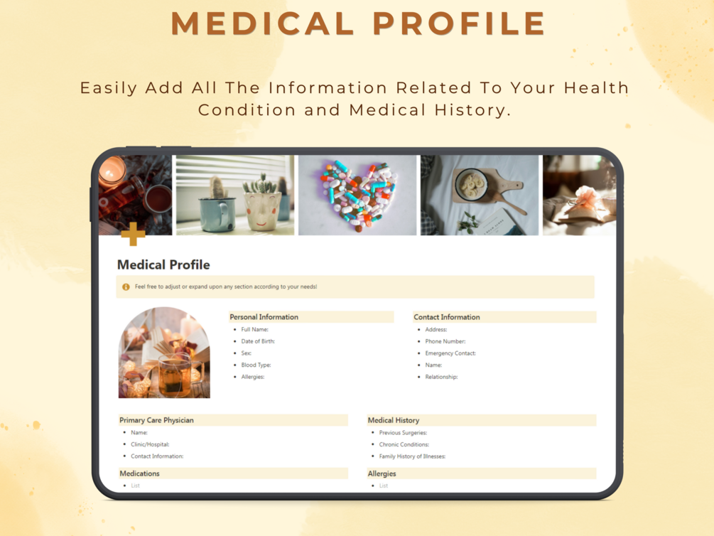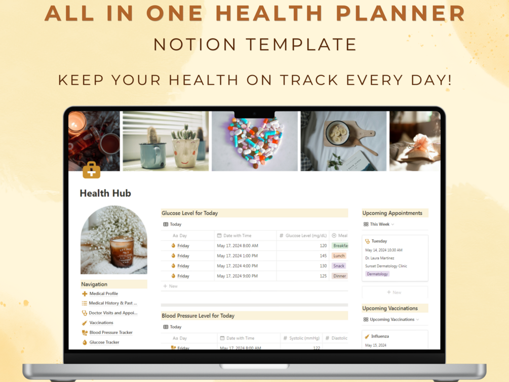 Introducing our All in One Notion Health Tracker Template – your ultimate Medical Planner designed to streamline your health management! Perfect for tracking doctor visits, medication, and immunizations, this aesthetic template ensures you stay organized in style. Monitor your blood pressure, glucose, and blood sugar levels with ease, and keep a detailed record of your medical history, allergies, symptoms, and past procedures.