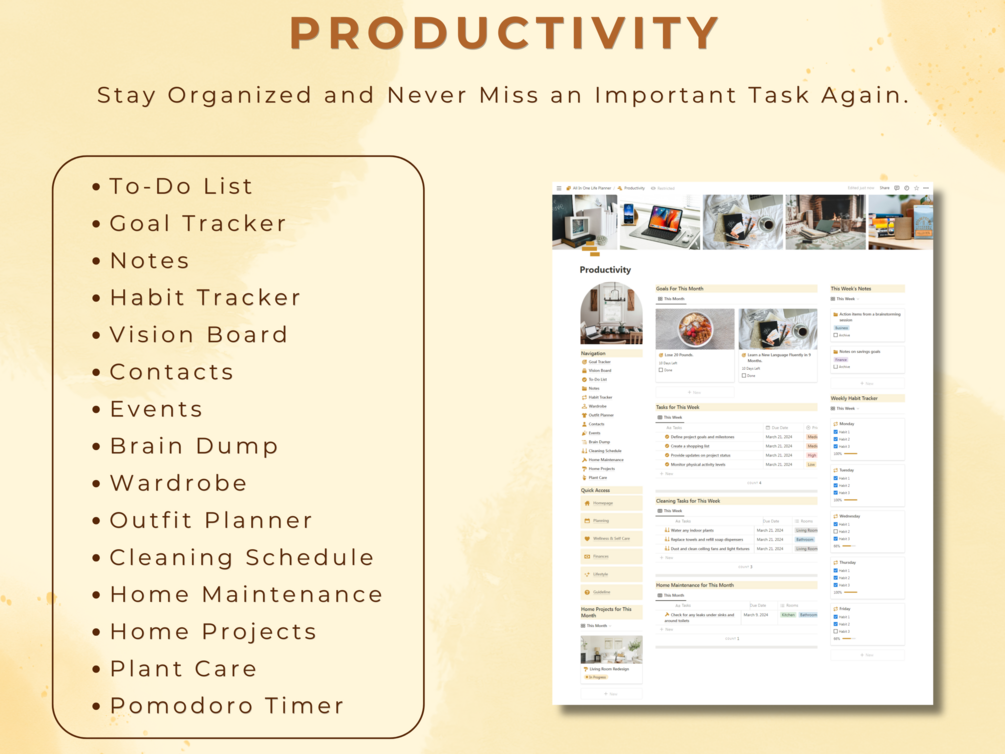 Imagine all your essentials in one place: seamlessly track your daily, weekly, and monthly goals; stay on top of tasks with a customizable to-do list, and reflect on your progress with the monthly reflection and annual review features. Prioritize self-care and wellness with dedicated habit trackers, and keep your finances in check with income and expense tracking.