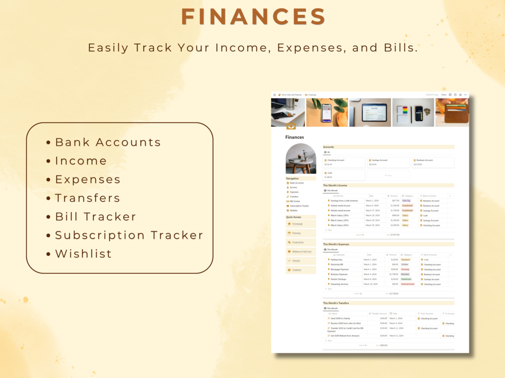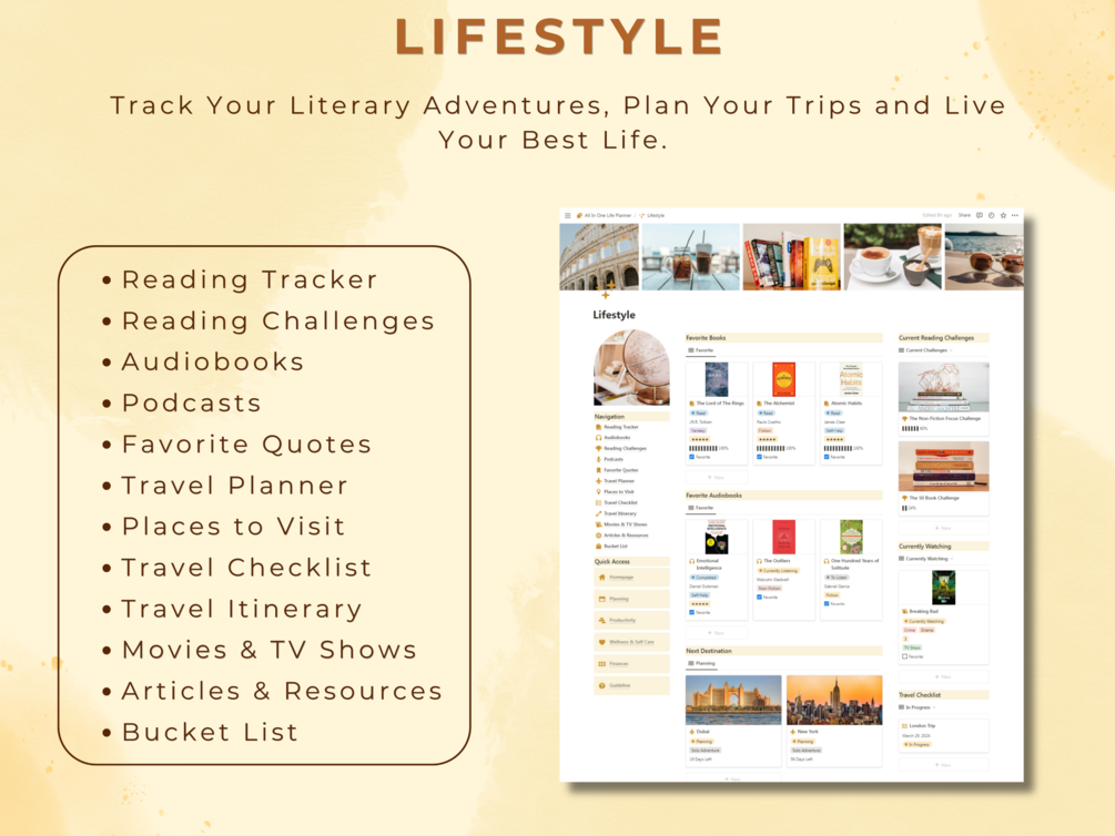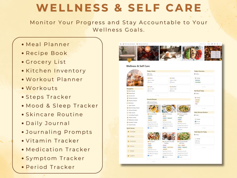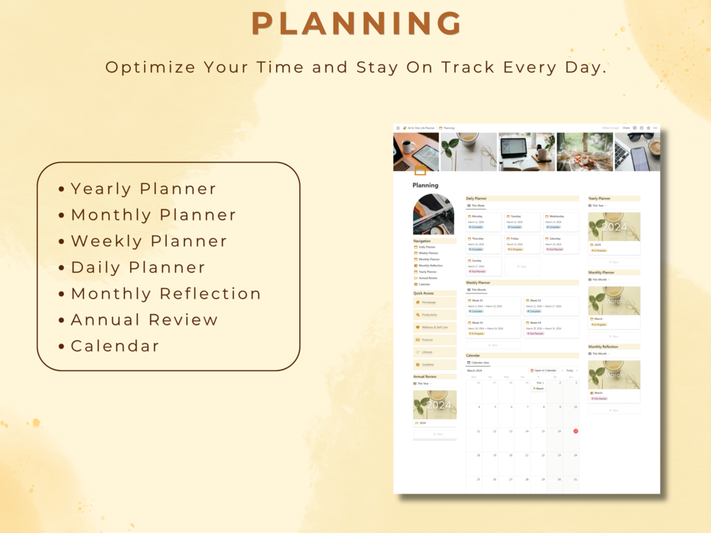 Imagine all your essentials in one place: seamlessly track your daily, weekly, and monthly goals; stay on top of tasks with a customizable to-do list, and reflect on your progress with the monthly reflection and annual review features. Prioritize self-care and wellness with dedicated habit trackers, and keep your finances in check with income and expense tracking.