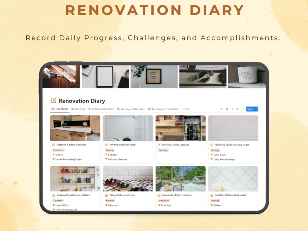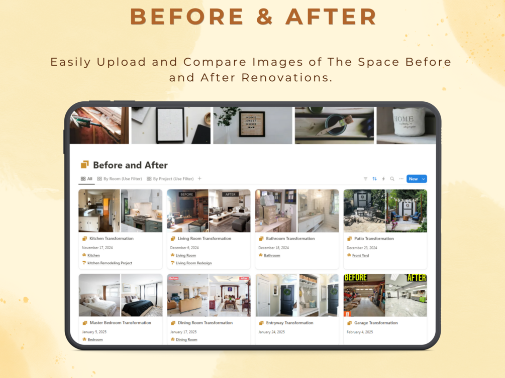 Tailored for homemakers, interior enthusiasts, and renovation pros, this template simplifies every aspect of planning. Track your budget and expenses with ease, manage your to-do lists, and coordinate with service providers all in one place. Stay inspired with a customizable Inspiration Board and showcase your progress with the Before and After tracker.